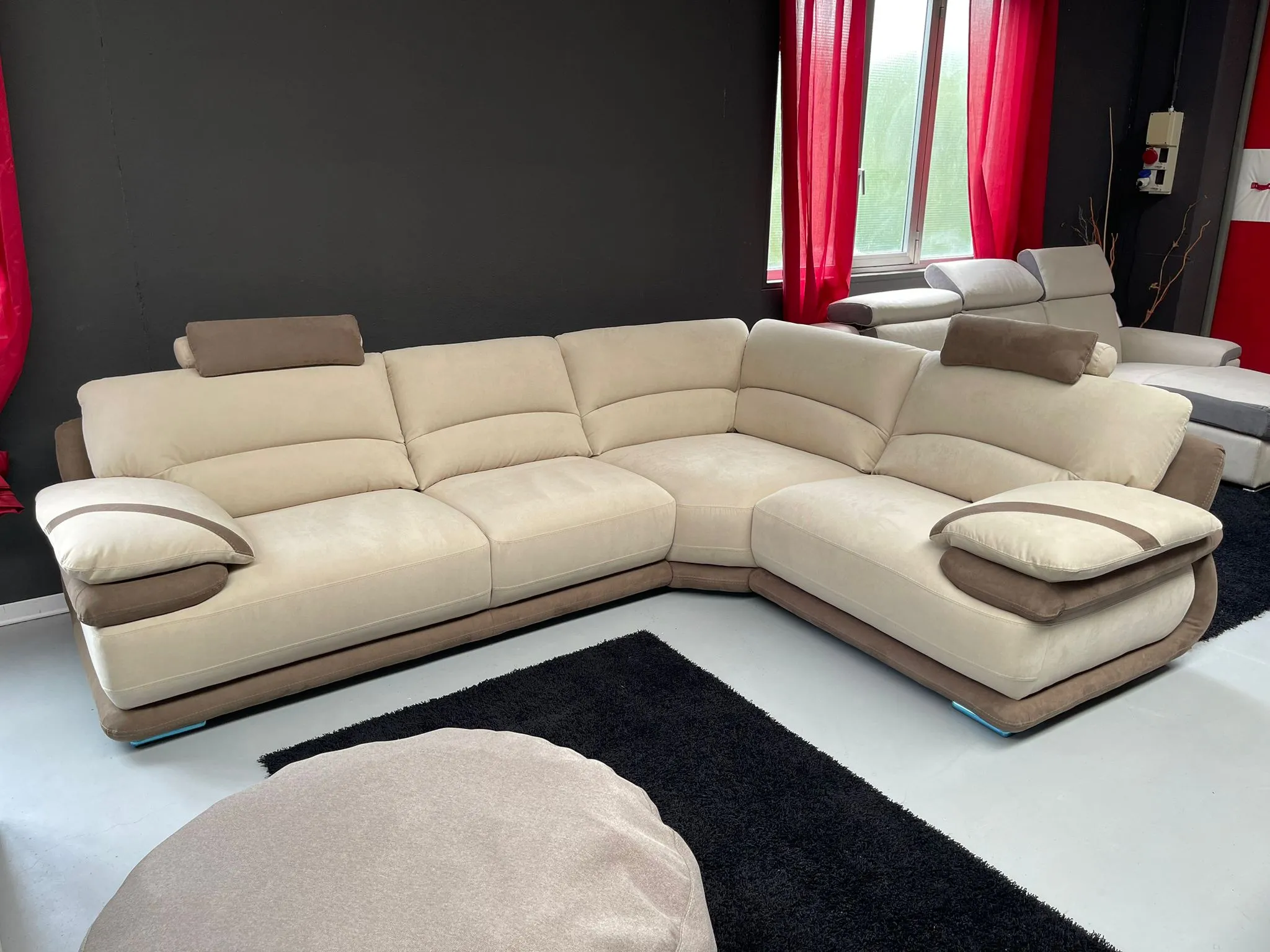Composizione reversibile 230x300 + 2 poggiatesta + pouf 100x70 tutta in tessuto effetto pelle