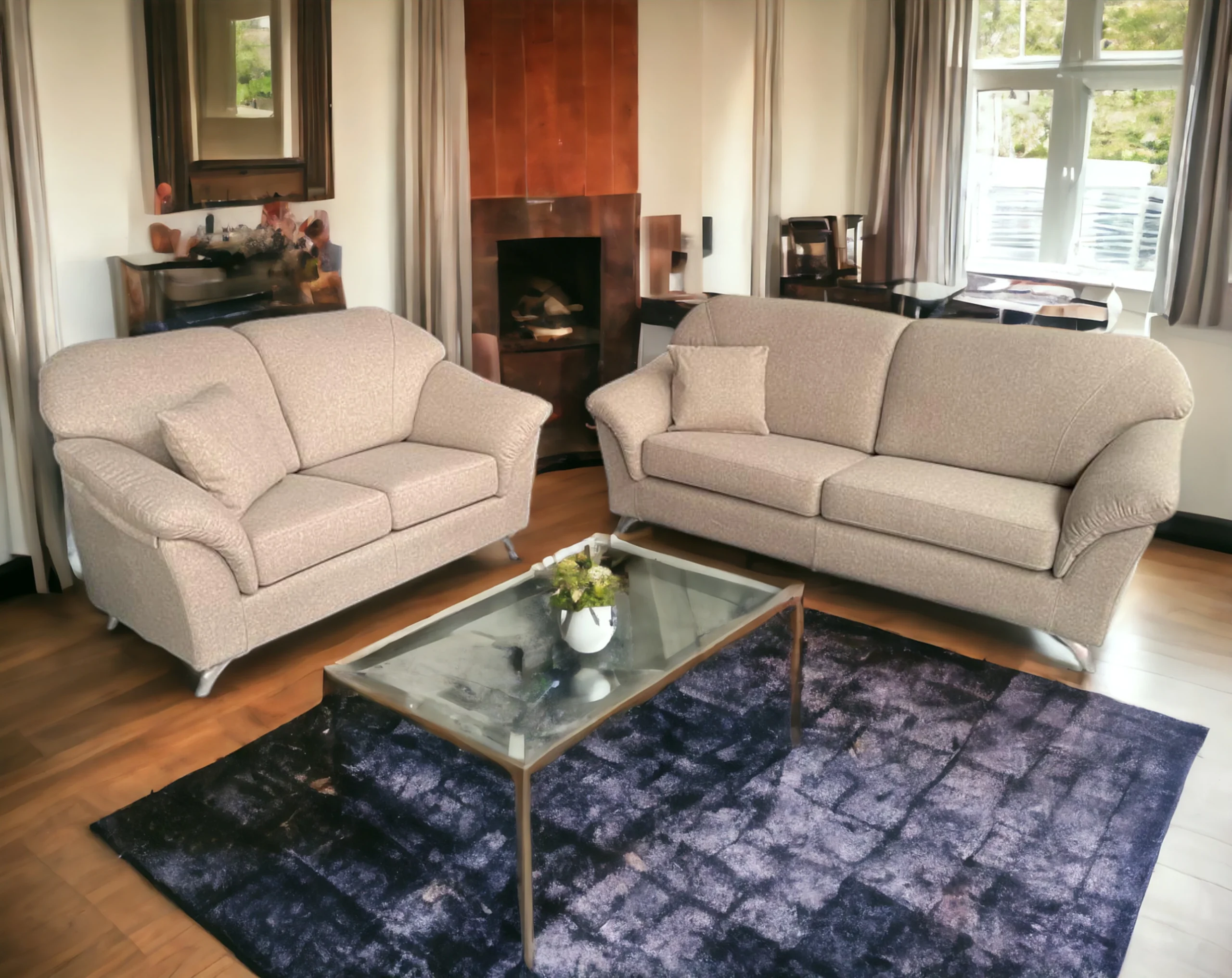 Composizione 3 posti + 3 posti con 4 schienali e 4 cuscini tutta in tessuto. Misure 3 posti singolo 218cm x 116cm x 90cm